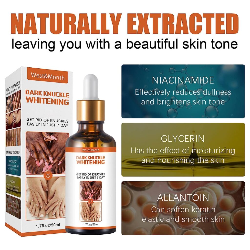 After using the serum for a few days, I noticed a significant improvement in the appearance of my dark kuckles. The serum also did not irritate my skin or cause any breakouts. Overall, I highly recommend this dark knuckle whitening serum for anyone looking for a fast and effective way to reduce the appearance of dark knuckles and ankles.